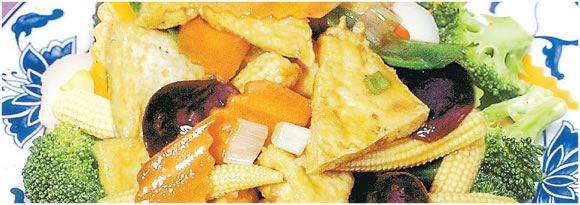 Fresh chicken, beef, pork, shrimp and Chinese vegetables in season, mixed brown sauce