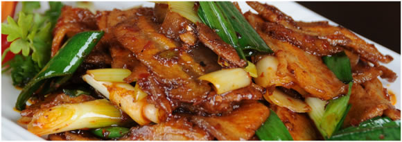 Sliced beef sauteed with mushroom, snow peas and bamboo shoots in brown sauce