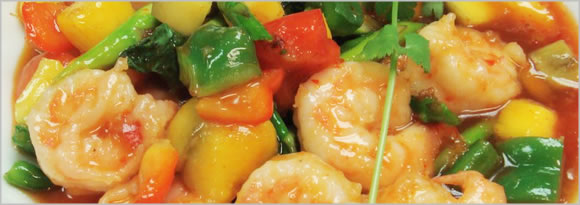 Jumbo shrimp stir-fried with carrots, waterchestnuts, red and green pepper, broccoli and Chinese vegetable mixed with white chef's special sauce